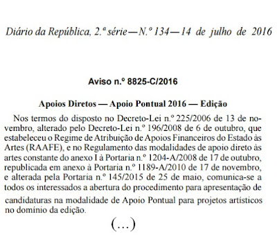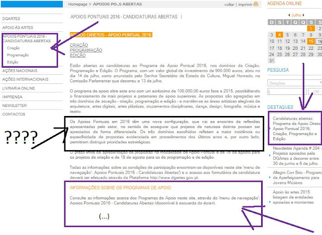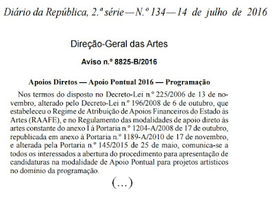 Correspondendo a perguntas que nos chegaram e contando com a colaboração de leitores do Elitário Para Todos, sobre os «Apoios Pontuais» em curso através da DGARTES: desde logo a «legislação especifica» nas imagens de inicio.Para saber aspectos práticos recorra ao site da DGARTES - caso esteja «em baixo» não desista - onde logo na homepage não faltam indicações que vão sendo «atualizadas». Ilustremos: