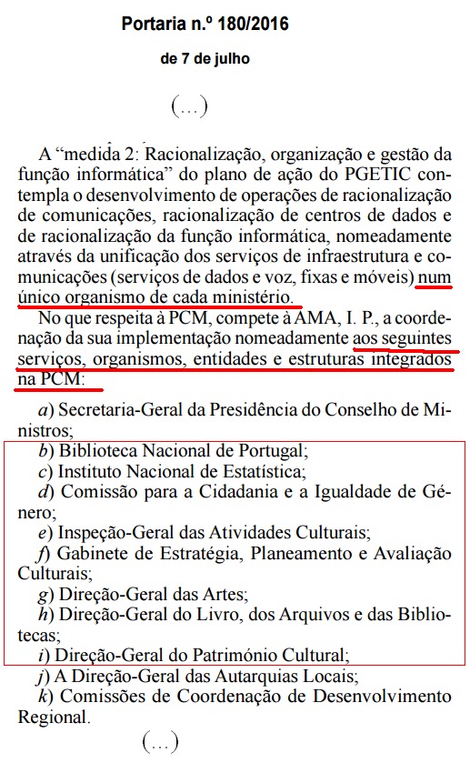 Mas o fixado na Portaria é até «pitoresco», começa por dizer que em cada Ministèrio haverá um único organismo para as atividades enunciadas e a seguir, sem qualquer explicação, mete os organismos da cultura na Presidência do Conselho de Ministros. Eventualmente, nem terão interiorizado que há Ministério da Cultura, e por inércia seguem as rotinas anteriores decorrentes de Secretário de Estado da Cultura sem Secretaria de Estado e que estava na Presidência do Conselho de Ministros. Como rapidamente se poderá concluir, há aqui princípios em jogo, há aqui promessas feitas que não estão a ser cumpridas. No que diz respeito à TRANSPARÊNCIA, não é preciso dizer mais nada. E por aqui fiquemos à espera de algo sobre a Cultura por parte do Governo, e dos Partidos que apoiam a solução governativa, que nos alegre.