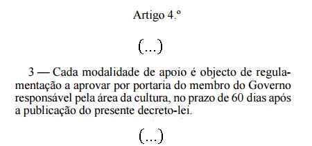 - E há um aspecto deveras relevante - de legalidade duvidosa - é o Ministro que assume toda a responsabilidade do que se anuncia para 2017. Ora, o sistema de apoios, bom ou mau, tinha sido de decisão do Conselho de Ministros. Não há nada no Decreto-Lei n.º 225/2006 de 13 de Setembro - que pode ver aqui, republicado, depois de alterado pelo Decreto-Lei n.º 196/2008 de 6 de Outubro - que diga que há um ano transitório nos termos decididos pelo Ministro da Cultura quando o Governo deixa passar o tempo, e que nos leva onde agora estamos. Indo ao detalhe, o n.º 3 do artigo 4.º do Decreto-Lei n.º 225/2006 ao abrigo do que o Ministro da Cultura publicou a Portaria (como se pode ver acima) diz isto: