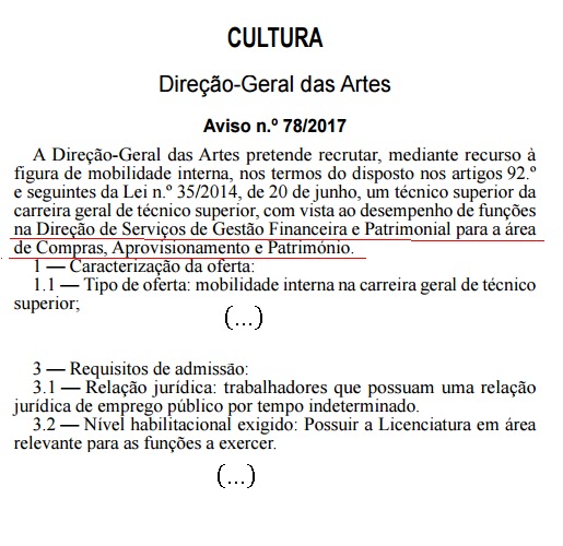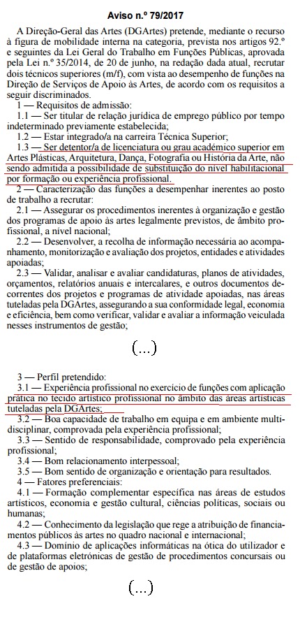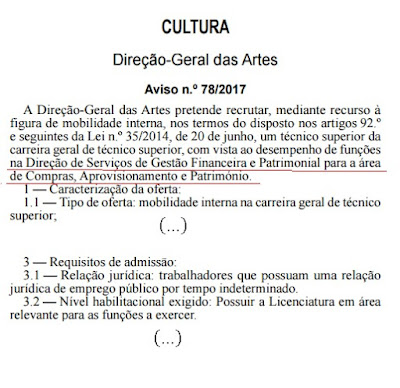 Para além do «tom autoritário e definitivo», uma pergunta muito simples: qual o potencial universo a que se destina? Atenção, estamos a visar pessoas que já estão vinculados à função pública. Ainda haverá gerações em atividade, ao serviço das Administrações Públicas, que quando foram admitidas não havia sequer alguns dos cursos listados nem graus fixados nos Avisos. E foram essas gerações que criaram o que o existe. Em particular, foram pessoas dessas gerações que fizeram a DGARTES. Se conseguirmos encontrar algumas delas é de admitir que seriam de grande valor para os serviços. Terão um capital fabuloso. Um dos grandes problemas que as Administrações vivem neste momento decorre da sangria que se verificou nos últimos anos com a saída dos «mais velhos», de forma desregrada, sem terem «passado memória». Mais, alguns dos atuais trabalhadores da DGARTES não passariam no crivo dos Avisos. E uma coisa é certa: pelos vistos na DGARTES não se precisa de quem saiba de gestão, de planeamento, de sistemas de informação, de sociologia, de ordenamento do território, de documentalistas, de politicas públicas, geografia, relações internacionais, ... Na Dgartes não entra quem, embora já seja funcionário público, tenha o grau naquelas áreas, a que podiamos juntar direito, economia, matemática, engenharia, história, literatura, informática ..., embora possam saber como ninguém do que a DGARTES precisa.