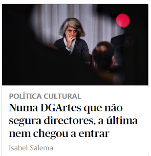 A imagem acima é do jornal Público sobre matéria a que diferentes orgãos de comunicação social deram cobertura. Escolhemos aquela porque revela bem o estado em que se encontra a Administração Pública Central na esfera da cultura, na circunstância na DGARTES. Pegue-se por onde se quiser. E se quisermos ver, concluiremos que não nos podemos quedar pela «espuma do dia». Por uma questão de sanidade mental, e de defesa do serviço público, temos de ir à causa das coisas. E facilmente se aceitará o que de há tanto tempo se anda a defender aqui neste blogue, começando, desde logo, por uma auditoria à DGARTES. Uma vez mais, querendo contribuir-se para o diagnóstico indispensável sem o qual dificilmente se encontrará rumo estratégico, de seguida alguns apontamentos.